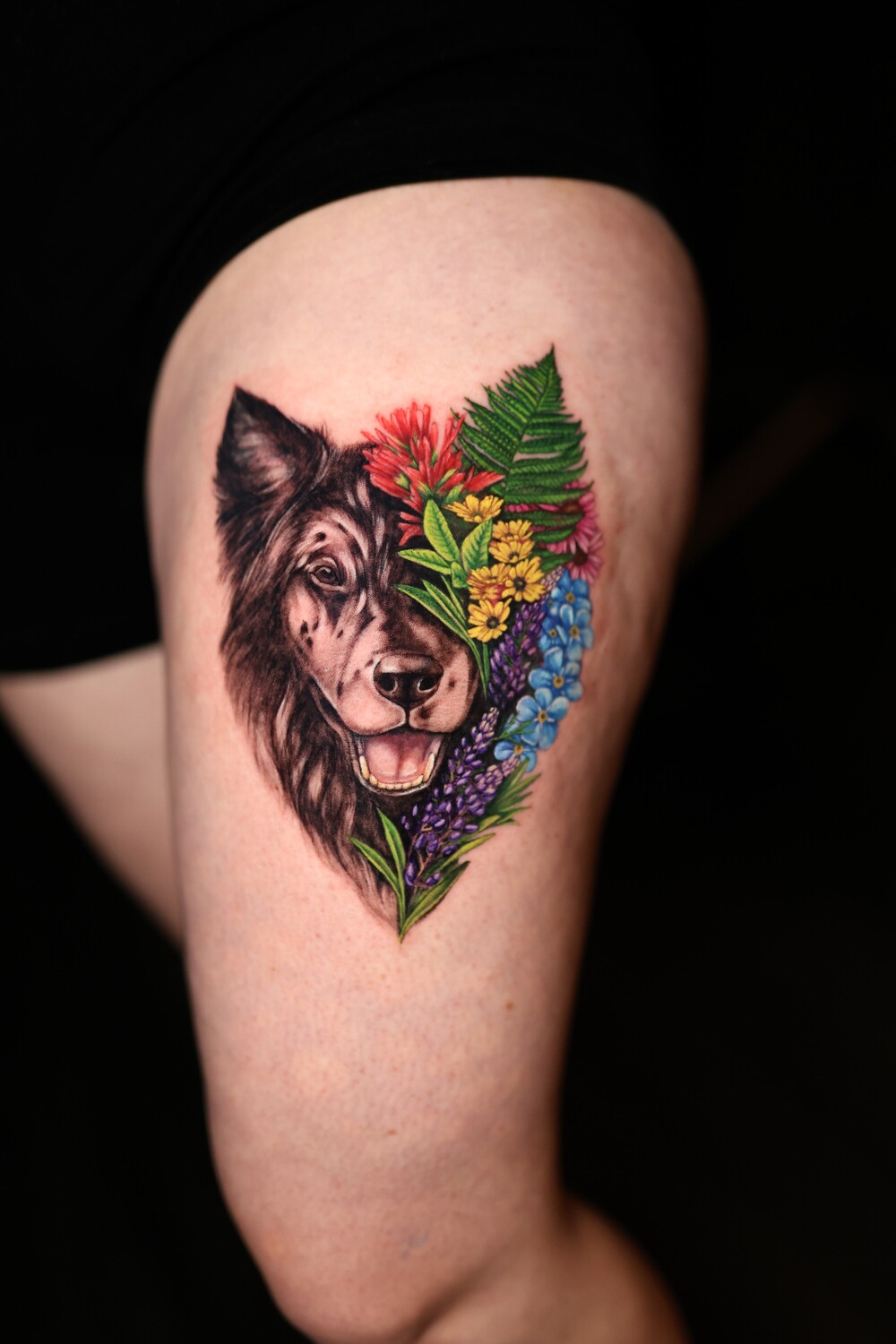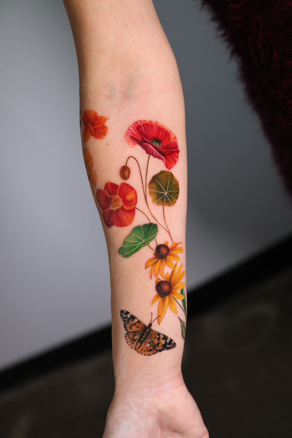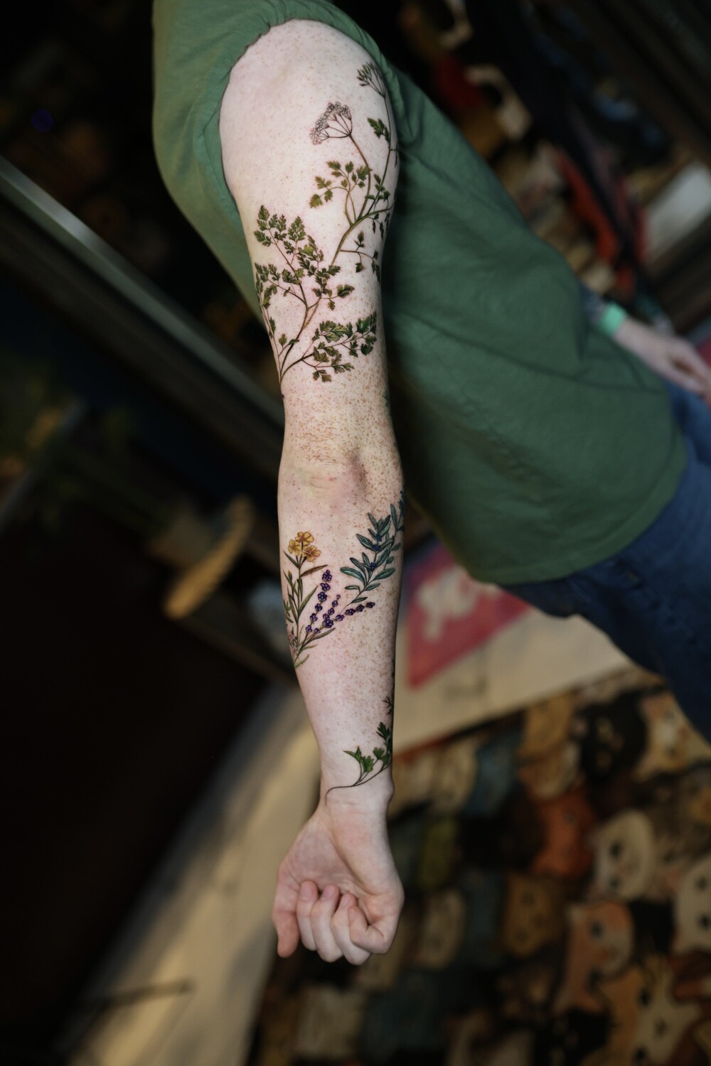 Her style sits at the intersection of botanical art and painting, with color compositions inspired by oil painting techniques. Plants and flowers form the core of her work, often complemented by birds, animals, insects, and pet portraits, giving her tattoos a sense of living, breathing nature.