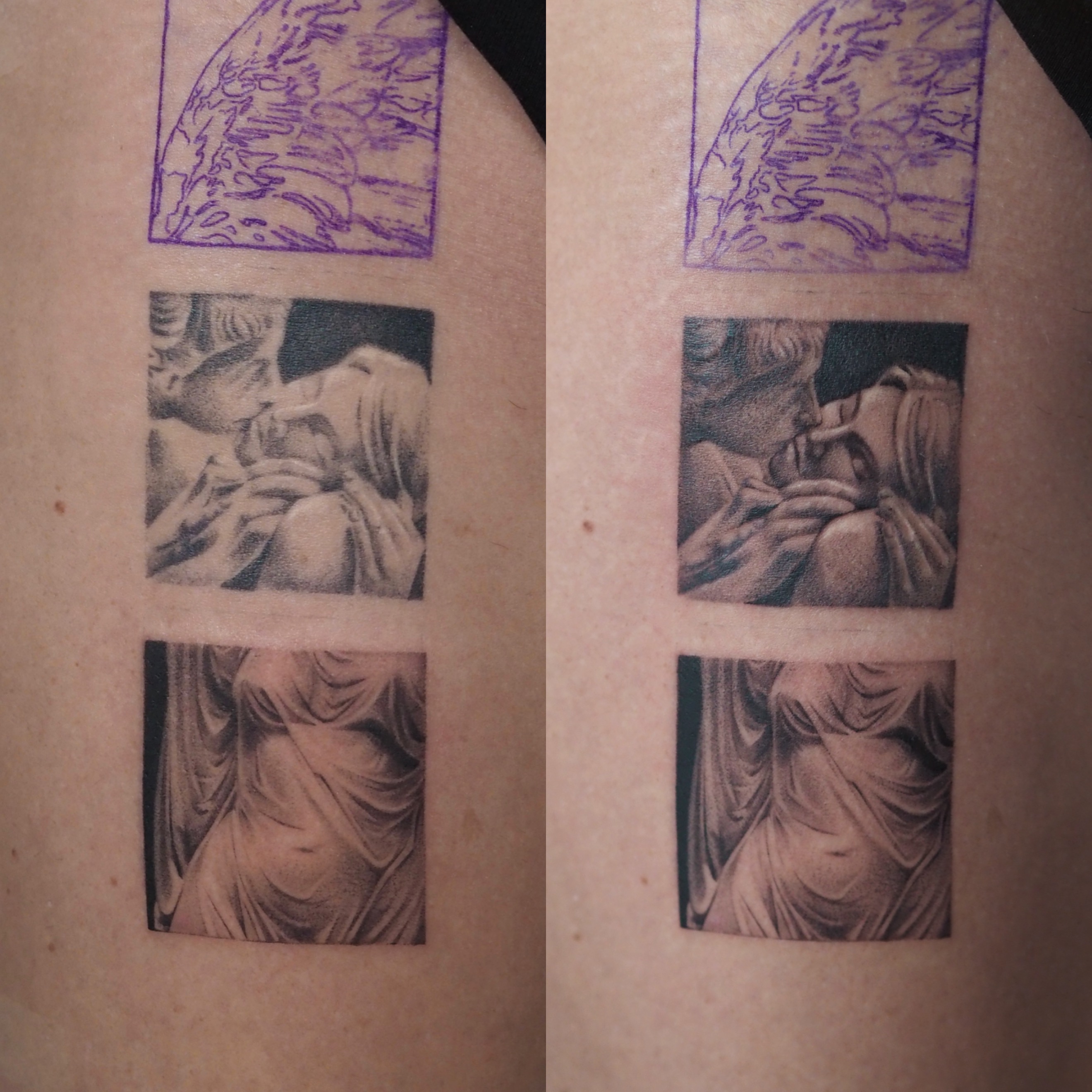 A separate focus within Anastasia’s portfolio is cover-up work and the correction of unsuccessful tattoos. Depending on the situation, this may involve careful restoration while preserving the original motif, incorporating elements of the existing tattoo into a new composition, or a complete transformation of a dark piece into a larger-scale project. Each case is approached individually, taking into account the condition of the skin and the characteristics of the original design.