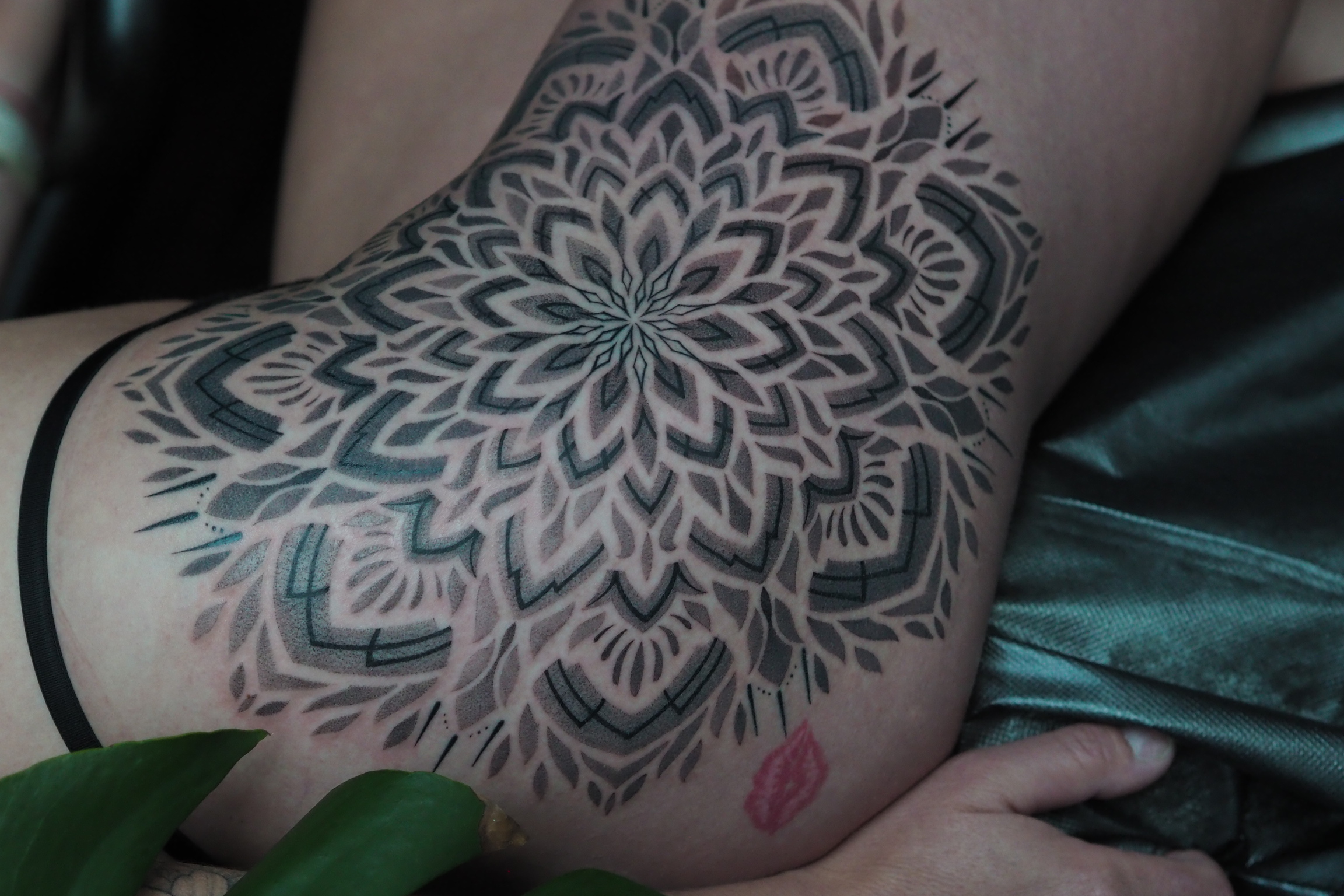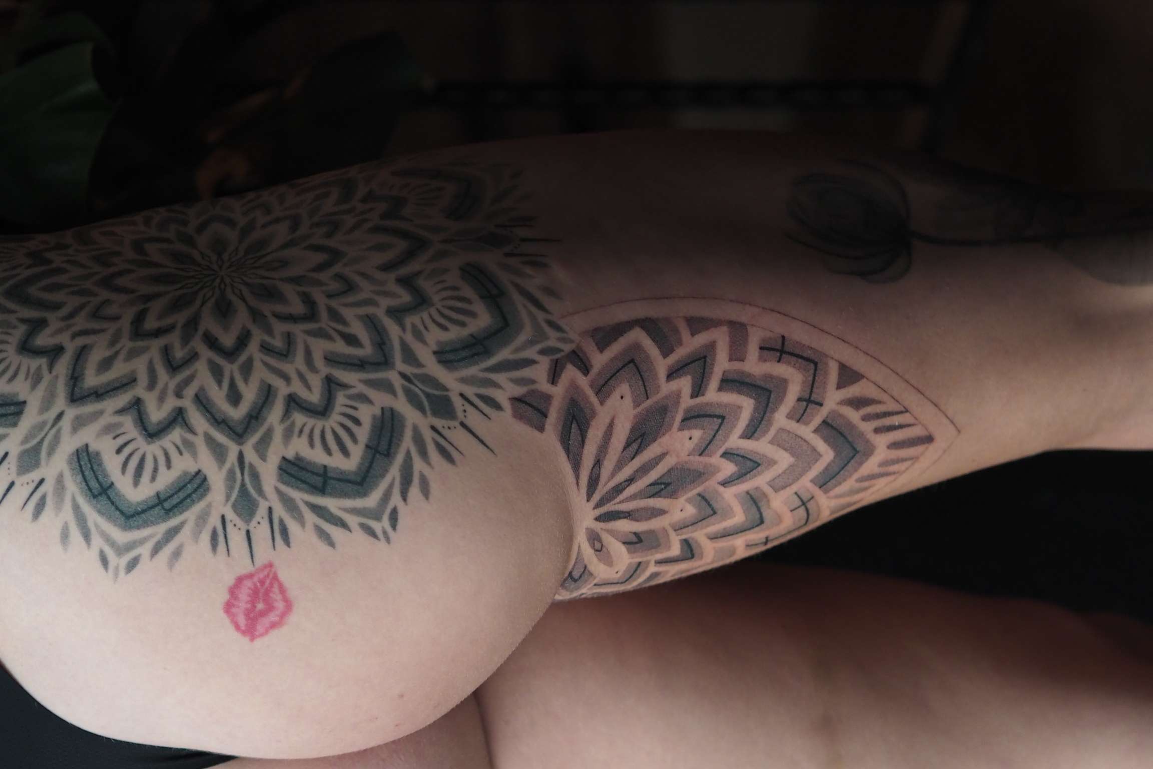 One of the most significant projects of her career is a large-scale full-leg piece that combines shadow-based ornamentation with lotus flowers executed in X-ray botanical aesthetics. The project develops slowly, over dozens of sessions, fully adapting to form, movement, and changes in posture.