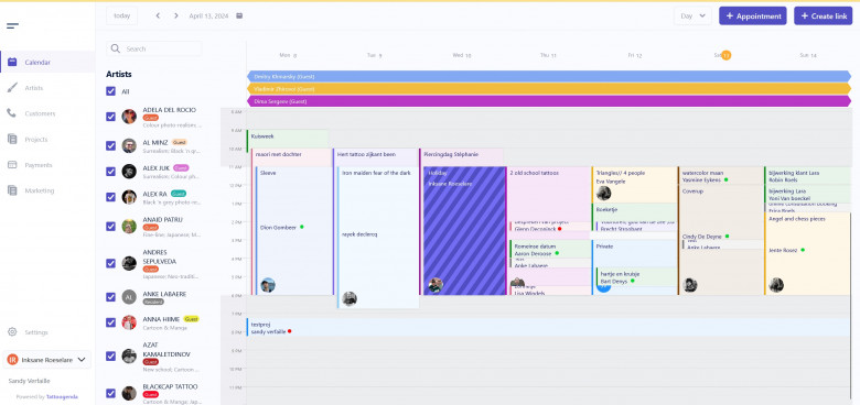 Digital Tattoo Studio Calendar: Tailored to the unique needs of tattoo studios, this feature streamlines appointment scheduling for both resident and guest artists, fostering seamless communication between artists and clients.