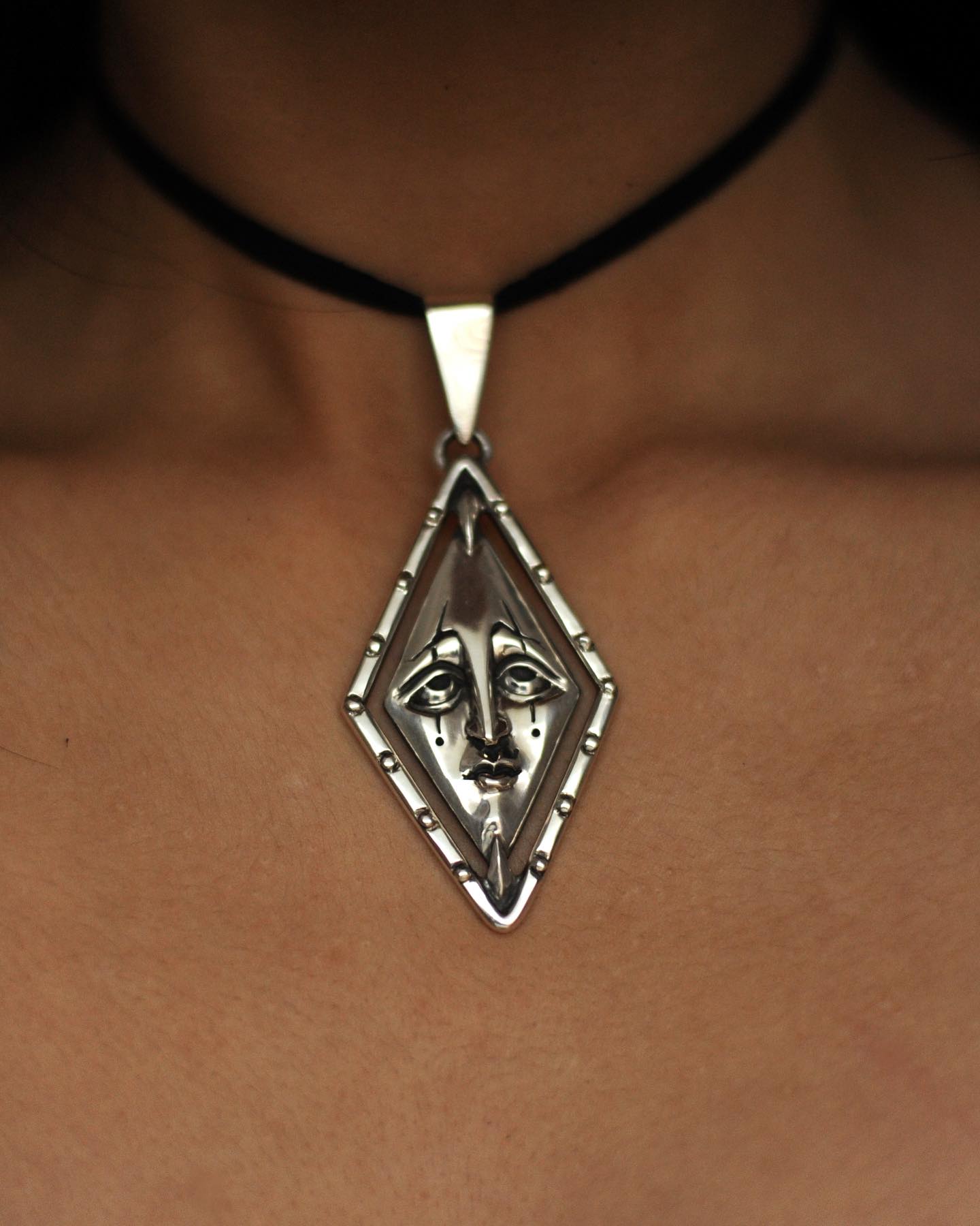 Украшения — моя маленькая слабость: у меня огромная коллекция вещей, которые я нахожу в путешествиях. У нас было много идей, но именно грустный персонаж стал нашим фаворитом. Я хотела разместить маленькое грустное клоунское лицо ближе к сердцу человека, который его носит — будто оно раскрывает скрытую эмоциональную часть его натуры.