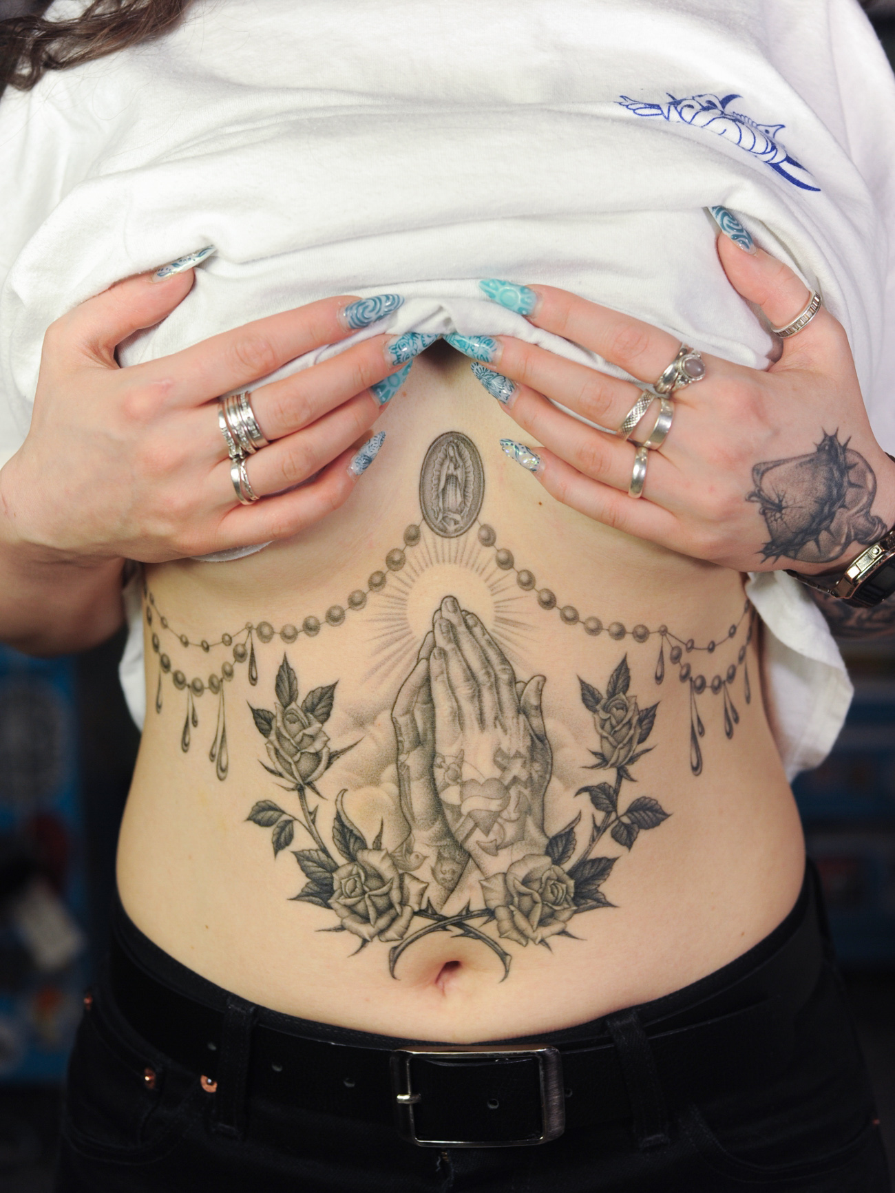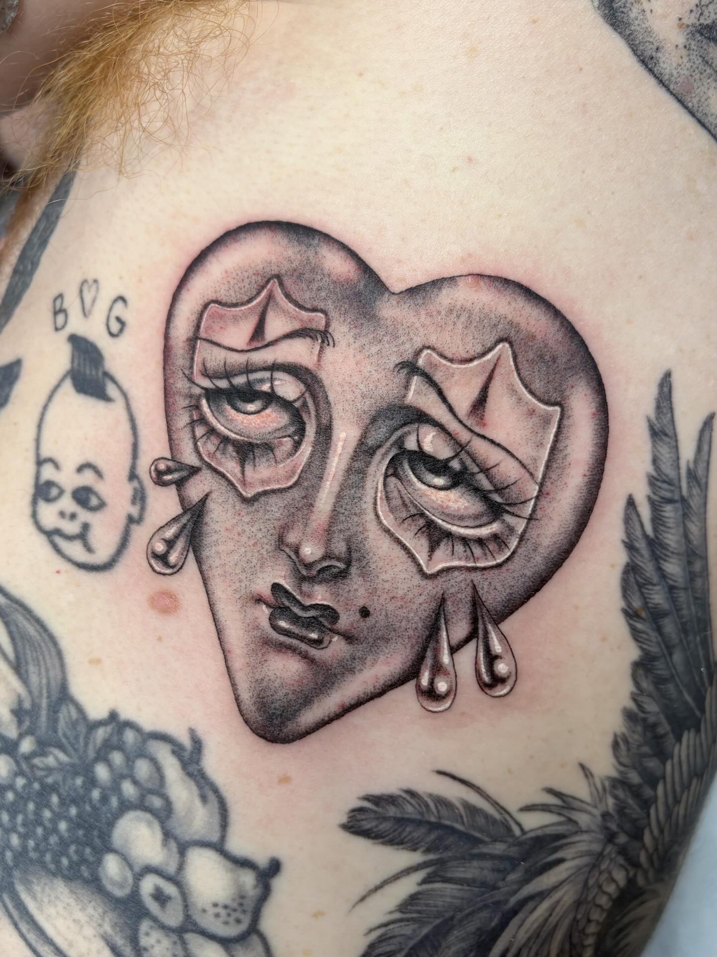И, конечно, все классические мотивы black & grey, уходящего корнями в культуру чикано — маски и клоуны, sacred hearts — от них я тоже не устаю.
