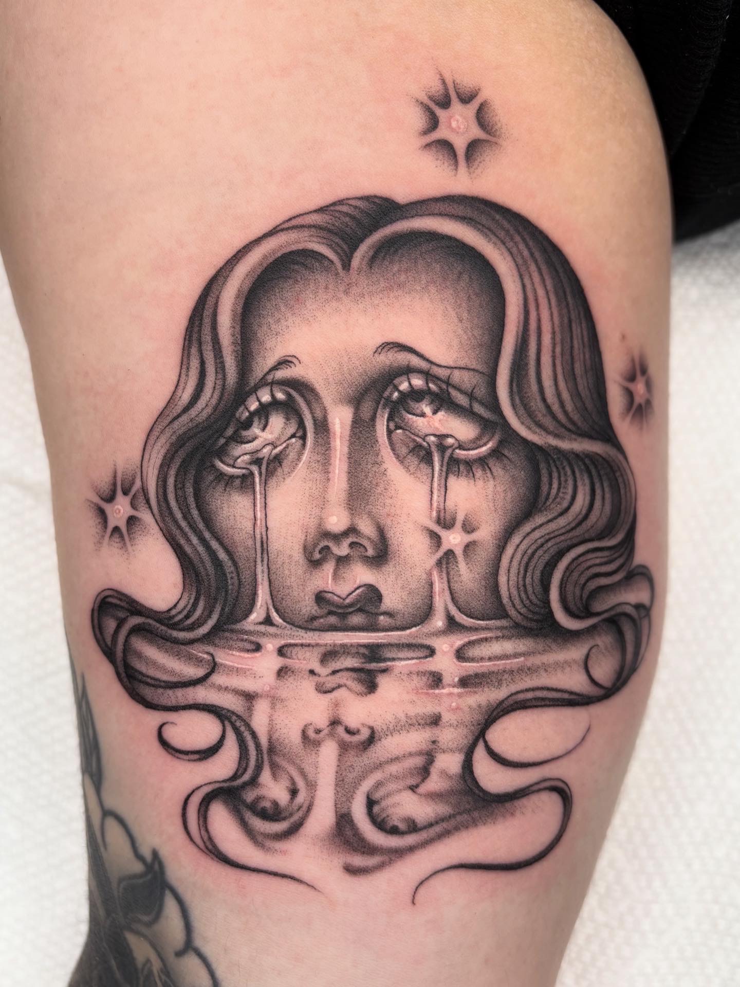Trang Nuen (capital.t.tattoo) — тату-мастер вьетнамского происхождения, выросшая в Варшаве. Руководствуясь собственным чувством формы и эмоции, она сформировала узнаваемый авторский стиль, в котором соединились влияния культуры чикано, традиций black & grey и отголоски средневековой живописи. Так появились её фирменные чёрно-серые персонажи — клоуны с опущенными веками, опустошённым взглядом и слезящимися слезами, ставшие центром её портфолио. Большинство работ Trang создаёт фрихэндом — прямо на коже, выстраивая каждую композицию под конкретного человека.