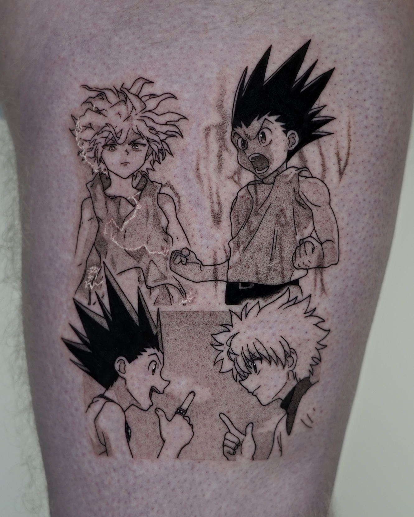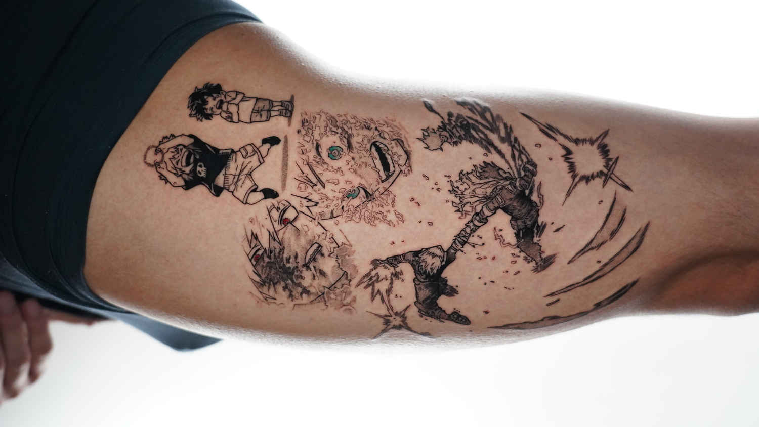 Nitzan: Я обычно работаю в чёрно-серой гамме, используя технику точечной штриховки, чтобы создавать тени, максимально похожие на текстуры, характерные для манги. Я уделяю большое внимание мимике и передаче эмоциональной глубины сцен и персонажей, которых выбирают мои клиенты. Часто я добавляю дополнительные элементы из манги или сюжета — например, текст или речевые облака. Многие мои татуировки построены в прямоугольных формах, напоминающих панели манги, или в других формах, например, в виде сердца. Вместо того чтобы рисовать буквальные рамки, я создаю иллюзию кадра с помощью чистой, контролируемой тени, благодаря чему татуировки часто выглядят так, будто они прямо со страницы манги.