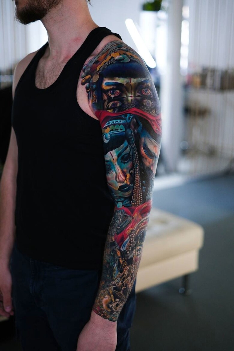 — Мы завершаем рукав по мотивам Джибаро — долгострой с 2022 года. Тогда у меня не хватало опыта работы с цветом, а сегодня всё «вкатано» как надо. В Instagram уже есть фрагменты, но полный рукав я ещё не показал. Остался один сеанс — и проект можно будет сфотографировать. Он одновременно сложный и вдохновляющий: сюжет, геометрия, цветной реализм — всё, что я люблю.