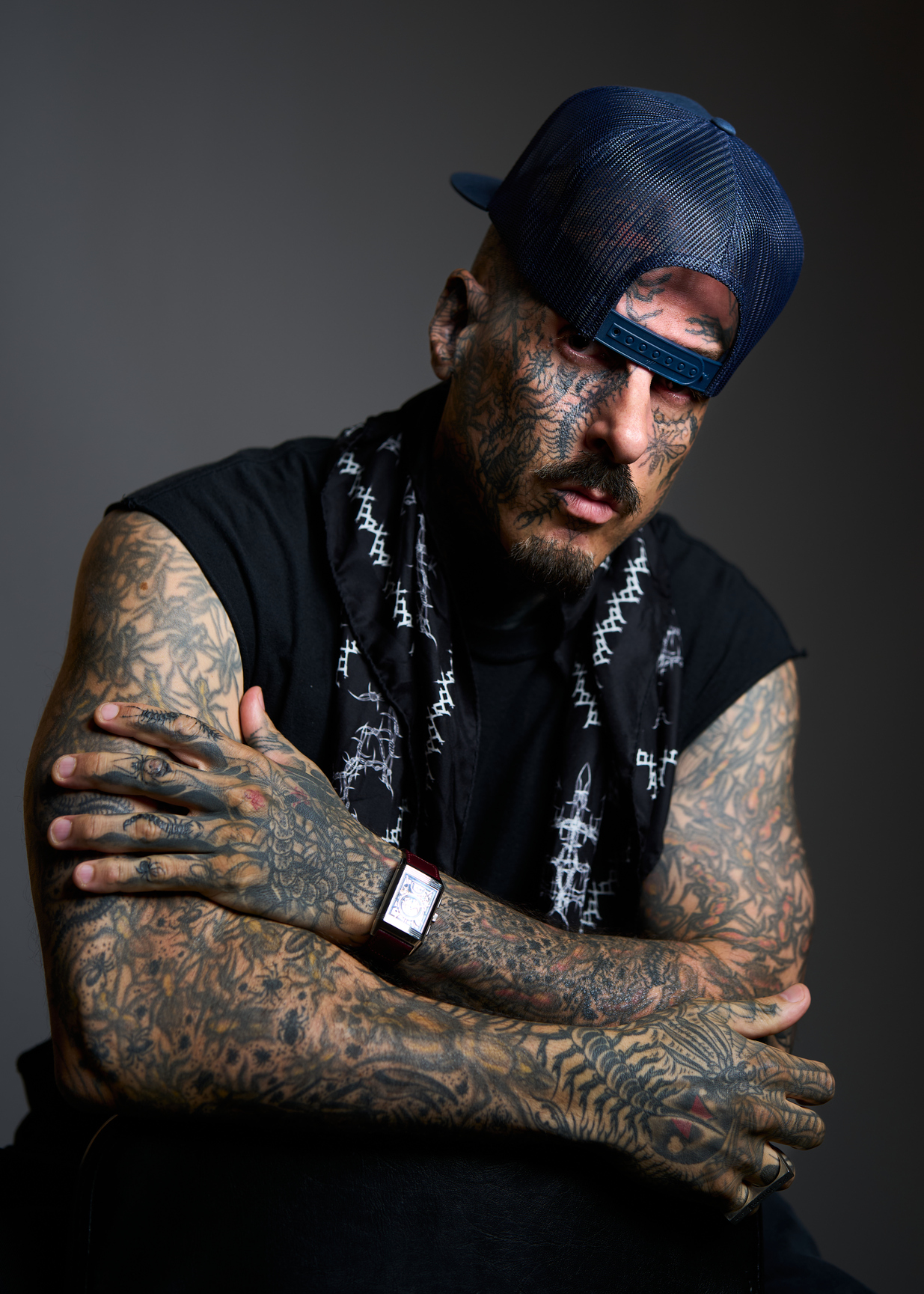 За последние 30 лет ведущие тату-художники мира помогли выстроить на его теле сложную биомеханическую вселенную. Многие работы изображают кожу, словно разрывающуюся изнутри, обнажая роившихся под ней существ. Эффект драматичный — но для Мойи он терапевтичен.