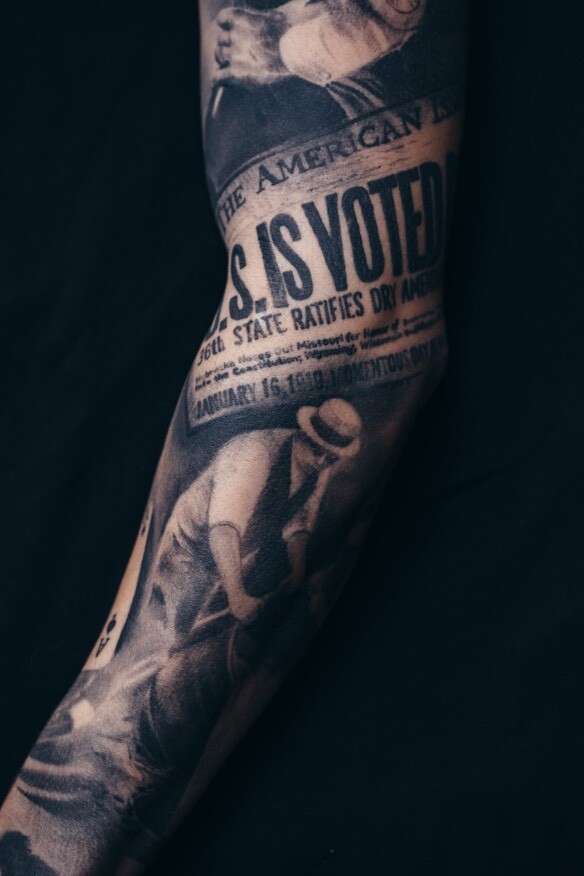— Мой бодисьют выполнен в чёрно-сером реализме. На груди у меня два орла, на одной ноге — тема любви и смерти, на руке — сюжет Французской революции, переосмысленный как шахматная партия, а ещё один рукав посвящён эпохе сухого закона в США с Аль Капоне. Меня очень интересует история начала XX века и её фотографическая хроника. Также у меня есть нога с мрачной романтической темой и много женских портретов.